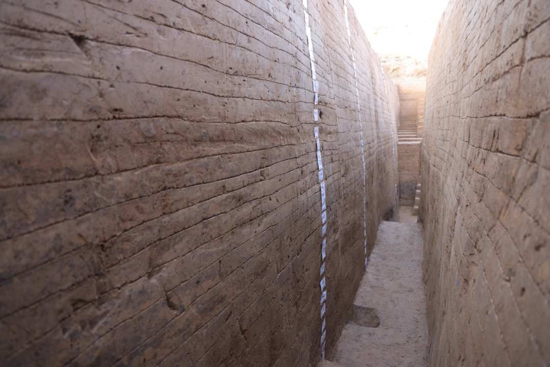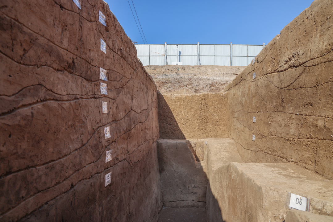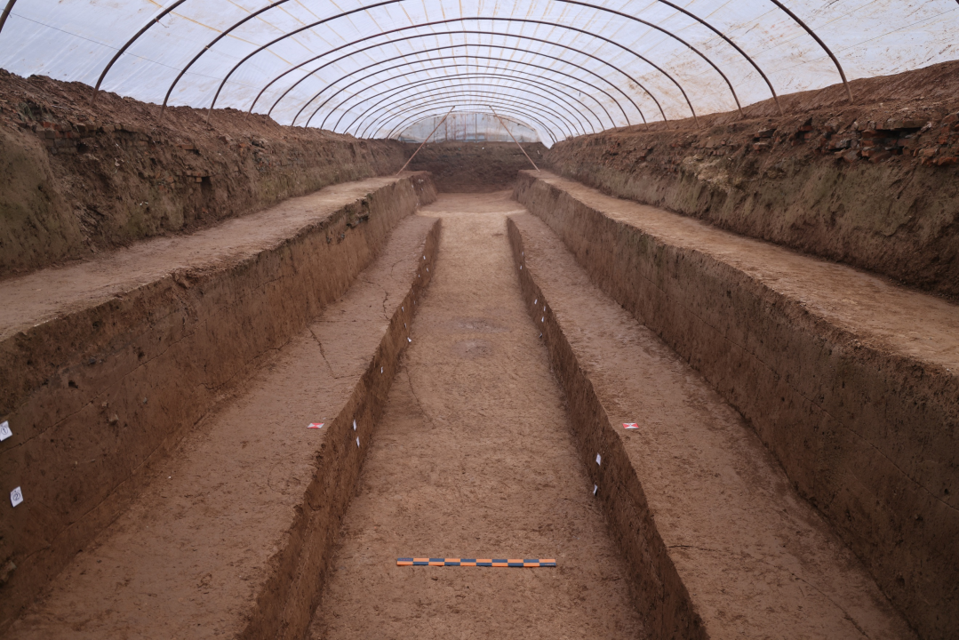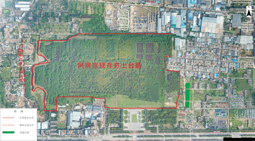 在2002年至2004年开展的阿房宫考古考古中,因台基东部已被村庄占压而无法开展全面勘探和试掘,仅在中部通过发掘确定台基南缘。在2015年的考古勘探中,确定台基南缘并非直线而是有所转折。在2025年发掘中,在探沟南段北部清理出阿房宫台基的南缘立面,残高1.3米,其南侧为未经夯打、因长期碾压而较紧密的斜状花土堆积,南缘之南还清理出夯筑台基时的柱洞等遗存。发掘区内阿房宫南缘的确定,为下一步开展更精确阿房宫保护提供了新资料。