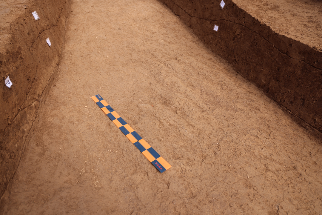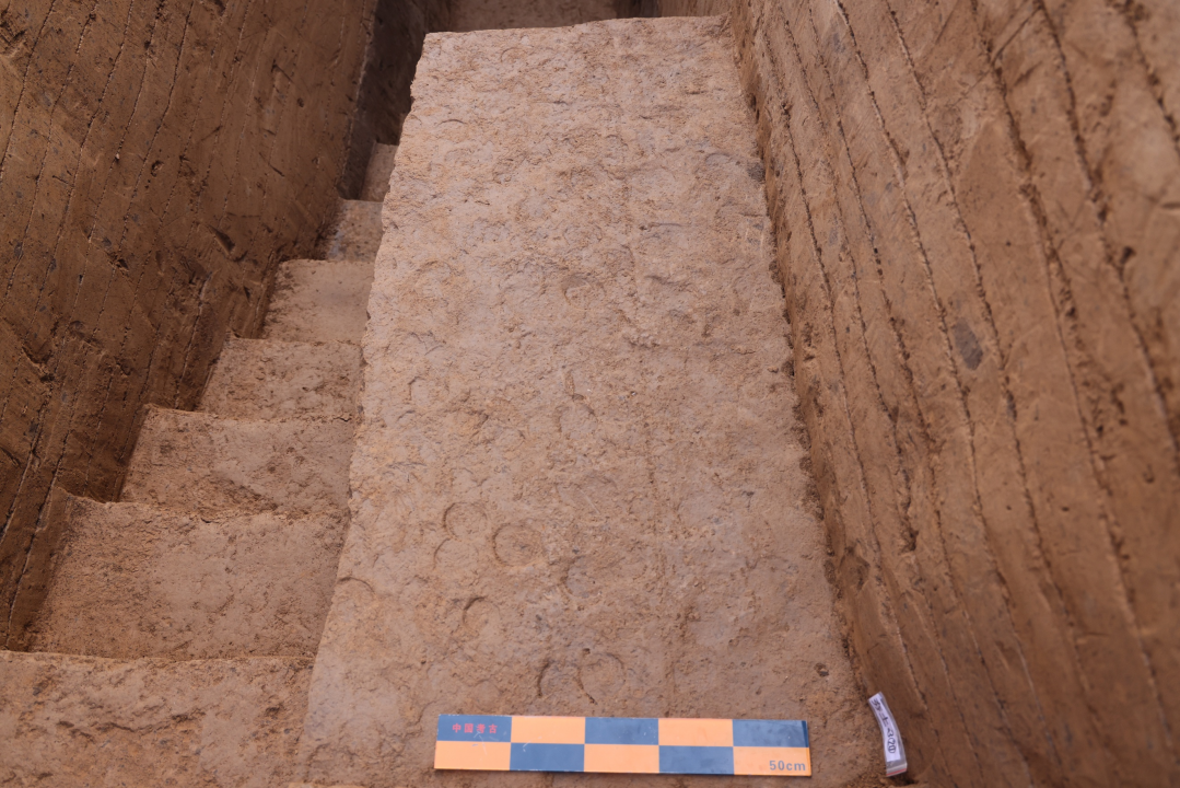 2025年发掘中,清理确认了上、下两层呈南低北高的踩踏硬面。受晚期破坏影响,上层硬面仅见于位于发掘区南端,其下6厘米~45厘米为下层硬面,在发掘区南端“合并”为一个硬面后,再向南仅存下层硬面。下层硬面在在台基外侧叠压于斜状花土之上,向北“穿入”阿房宫夯土,在发掘区北段的北部消失,发掘区内南北长140.5米。硬面均质地坚硬、有明显层状节理,下层硬面上可见多处东南——西北向车辙。