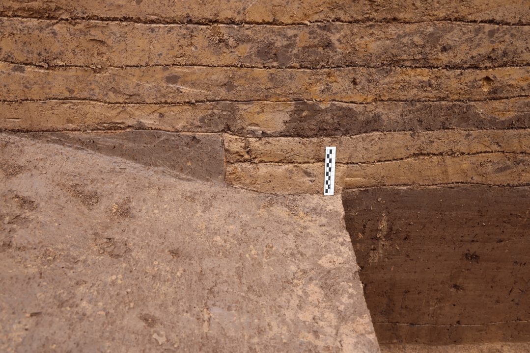 TG20北段-夯4与夯3版筑界限及版筑支撑柱洞遗迹照(自东南向西北)