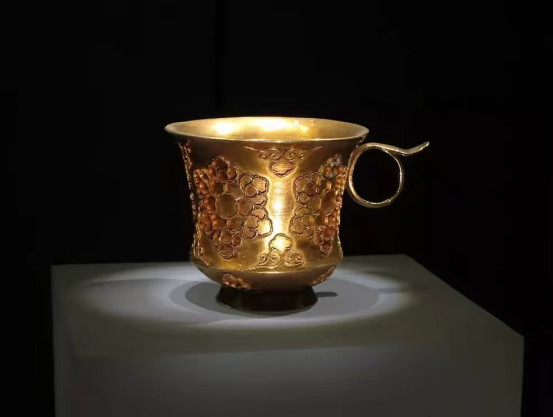 出土时,这些金丝内还镶嵌有各色漂亮的宝石!我们把这种在器物表面焊接金丝编成的外框及细密的金珠,再镶嵌以宝石的工艺叫“金筐宝钿”。由此,我们不难想象这件散发着皇家贵族气质的金杯曾经完美闪耀的模样!