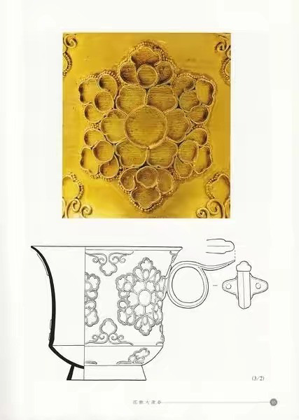 金杯被打磨光滑的杯腹表面,装饰有金丝焊接的四大朵团花,金丝外围又焊接有以细密的小金珠。上下腹部焊接有云头纹,形成了立体感极强的装饰效果!