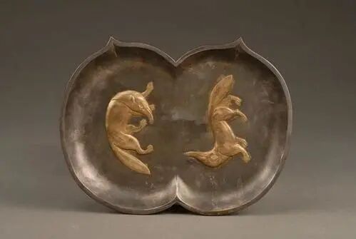 盘身为相连的双桃形,浅腹、平底,窄平折沿,锤击成型,纹饰涂金。两个桃形盘中心以模冲法冲出两只首尾错置、相互顾盼的狐狸,造型极为生动。