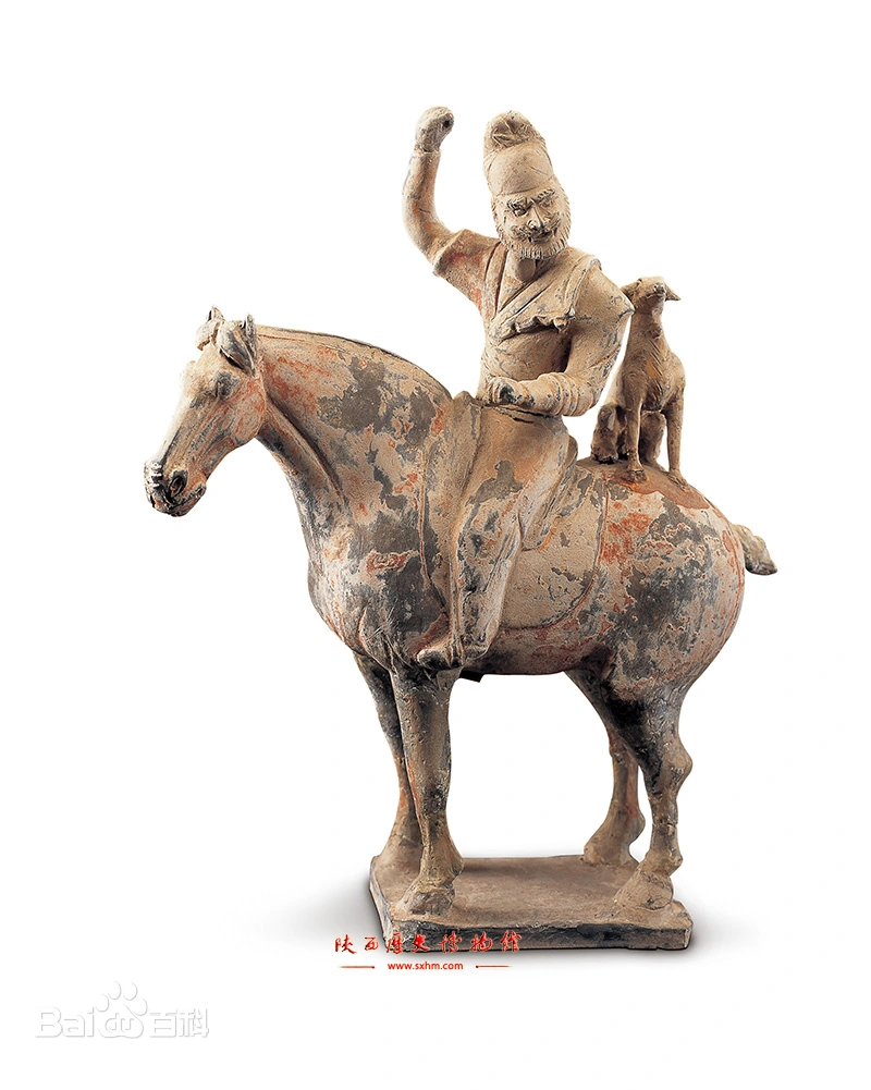 唐彩绘胡人骑马带犬狩猎俑于1960年在陕西省乾县永泰公主墓中出土,骑手为一胡人,,头戴幞头,深目高鼻,络腮胡,身穿翻领袍服,外罩坎肩,身体侧向左方,左手半握作持缰状,马鞍后蹲坐着一只猎犬,胡人右臂高高举起,似正挥拳驱叱猎犬行猎。