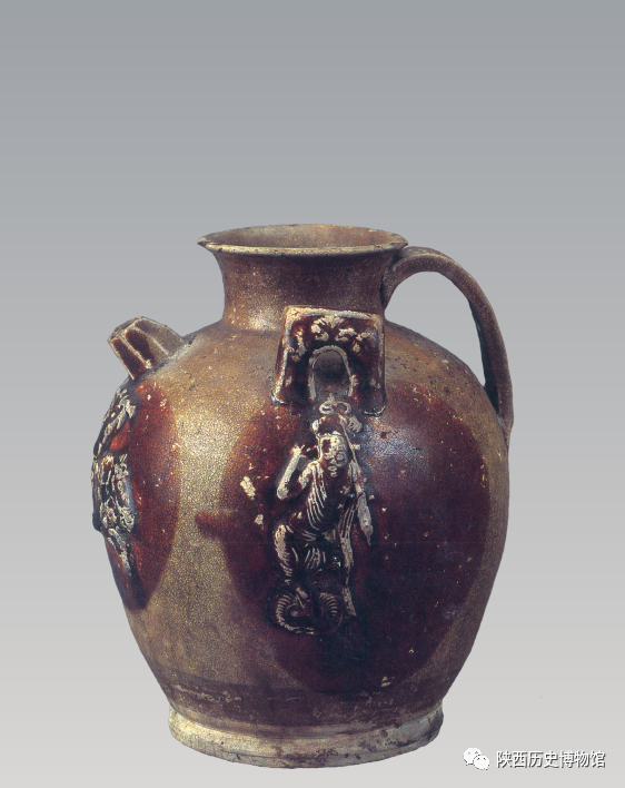 除陆上丝绸之路外,唐代各地的物品也通过海上丝绸之路传入世界各地,而相应的遗物便是明证。最有代表性的器物就是在安康出土的一件酱釉贴花乐舞纹执壶。此壶出土地安康,地处中国自然和人文的分界线秦岭南麓,曾是南北水陆交通的要道之一,也是中国南北经济文化深入交融之地。此壶是长沙窑的典型外销器品种,纹饰图案内容分别为胡人吹笛演奏和舞蹈等,其特点是壶腹部贴饰花纹后,只在图案部分的表面蘸施酱褐色釉。而长沙窑是唐代著名的南方窑场,其产品丰富,产量巨大,不仅造型多样,装饰手法亦丰富多彩。最突出的是釉下彩装饰工艺。近年在印度尼西亚附近海底发现并打捞出的阿拉伯商船“黑石号”上的绝大多数瓷器产自长沙窑,其中就有与此壶形制纹饰几乎完全相同的执壶。可见长沙窑瓷器不仅深受唐代各地百姓的喜欢,在海上丝绸之路贸易中也占有十分重要的地位。