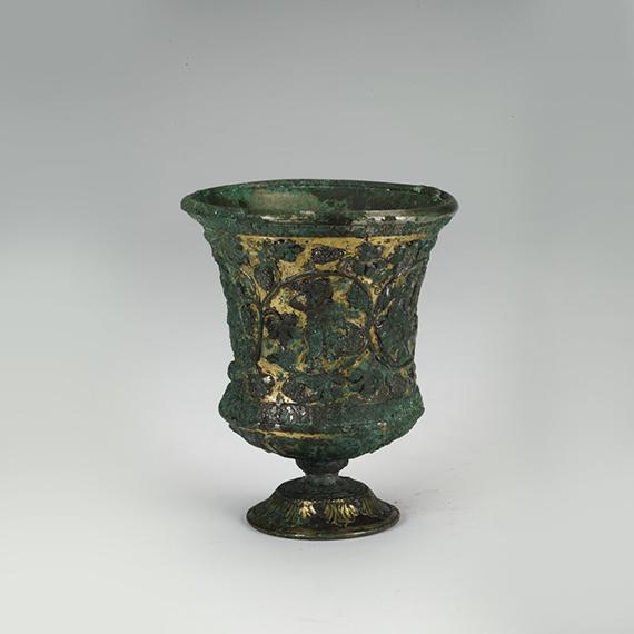 描述:敞口,深腹,腹壁呈束腰状弧形,高足。杯外装饰有缠枝葡萄,枝繁叶茂,果实累累,由葡萄藤组成的五个圆环布满外壁。葡萄藤上饰有飞鸟,在环绕外壁的五个圆环中饰有童子,五个童子形态各异。腹底饰花叶纹与联珠纹各一周,圆底外周饰“阿堪突斯”叶纹。这种题材应与希腊和罗马神话中的酒神节有关,应是舶来品。