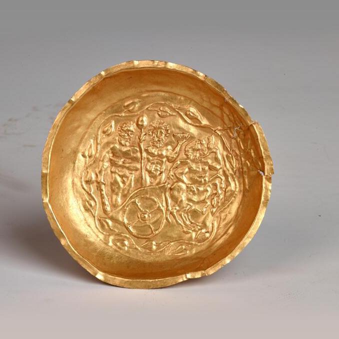 描述:金质。盘敞口,平沿,浅腹,平底。盘底锤揲环绕缠枝桃形叶纹,内有四位神话人物形象,两位半马人拉一战车,其中一位右手叉腰,左手紧握号角作吹奏状;战车上立两位,前者右手握权杖,左手托物,后者左手托物,右手握杵。所有人物均深目高鼻,须发卷曲浓密,肌肉隆起,健壮勇猛,具有明显的希腊罗马雕塑风格。