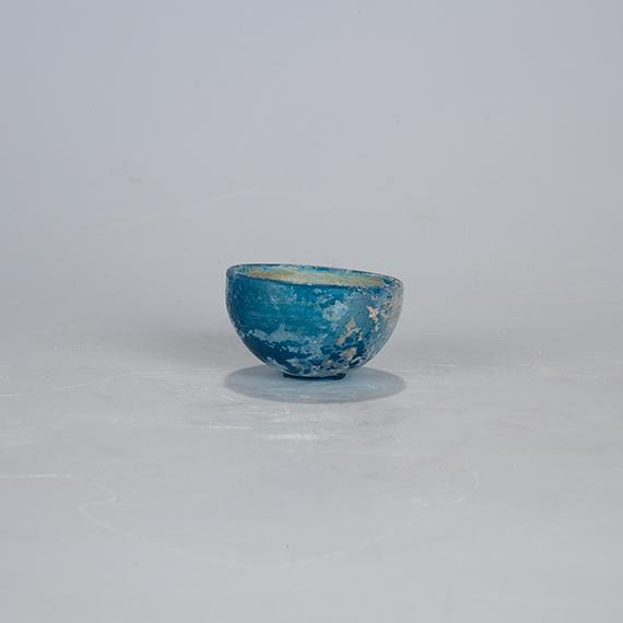 描述:这件器物整体呈半球形,圆唇、圜底,质地为天青色玻璃。整件文物器型小巧,可能是为墓主人专门而制的明器。