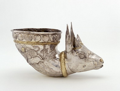 以上所介绍的都是从考古和文献记载的中国传统具有的角杯。到了唐代,大唐以其鼎盛、开放、包容的特性,吸引了四方各族、各国前来学习和交流,所以唐代是中西文化交流的鼎盛时期。特别是经过唐高祖和太宗以及高宗的努力肃清了西北疆域突厥等的侵扰,设立了羁縻都护府和都督府,保证了丝绸之路的畅通。在这种背景下大量的外来文化涌入国内,出现另一种类型的角杯,由于希腊人称之为rhyton,所以被称为“来通”。这是一种典型的外来器物,最早起源于西方,后来传到亚洲,并广泛流传于美索不达米亚至外阿姆河地带的广大区域,后传至入中国。据孙机先生考证,来通有以下几个特征:1.来通的头部都有兽头例如羊首、马首、牛首、狮首等及其他怪兽的首形。2.在兽头部位都有流,用来饮酒的时候,酒从其下端的孔中泻出,注入饮者的口中。来通被认为是一种圣物,用它注酒能防止中毒,如果举起来通将酒一饮而尽,则是向酒神致敬的表示[6]。如现藏美国弗利尔美术馆(Freer and Sackler Galleries)萨珊王朝的银来通,弗利尔美术馆对这个器物的描述也是装有嘴的容器(spouted vessel)。(图五)