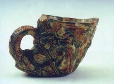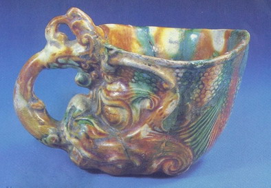 2.湖北省郧县唐代李徽墓出土的三彩角形杯(图十)器身满饰浮雕状草叶花纹。角杯把为一龙首上卷而成。器内饰黄绿釉,器外施黄釉。由于受潮,器外的釉已出现银化现象[14]。