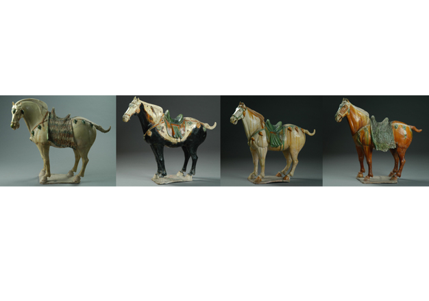 安菩墓出土三彩马(共四件),唐代,釉陶器,从左至右:三彩白釉马,高70厘米;三彩黑釉马,高72.5厘米;三彩贴杏叶饰白釉马,高75厘米;三彩绿障泥红釉马,高75厘米。1981年洛阳龙门安菩墓[1]出土,现藏洛阳博物馆。