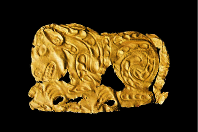 摘要: 战国清水县刘坪出土长8.4厘米;-8.5厘米,宽5.5-5.7厘米。工艺技法采用常见的锤碟法,在薄的金片的背面錾刻虎形,正面隆起,边缘剪切,四角有钉孔。虎呈蹲踞形,眼、鼻、耳、嘴、齿、爪都十分清晰,虎张嘴,伸沟状前爪抓住一羊。