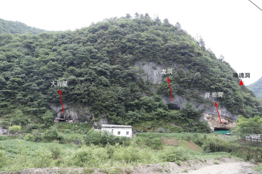 黄连队洞穴群由4个洞穴组成,位于神农架林区大九湖镇坪阡村四组,海拔高度1565米。洞穴群北靠岩屋坪山,西南为山谷,一条无名小溪在洞前汇入东溪,向东流至坪阡水库内。走访当地村民得知,4个洞穴自西向东依次名为大岩屋、龙洞、羊圈洞、唤魂洞(图二)。