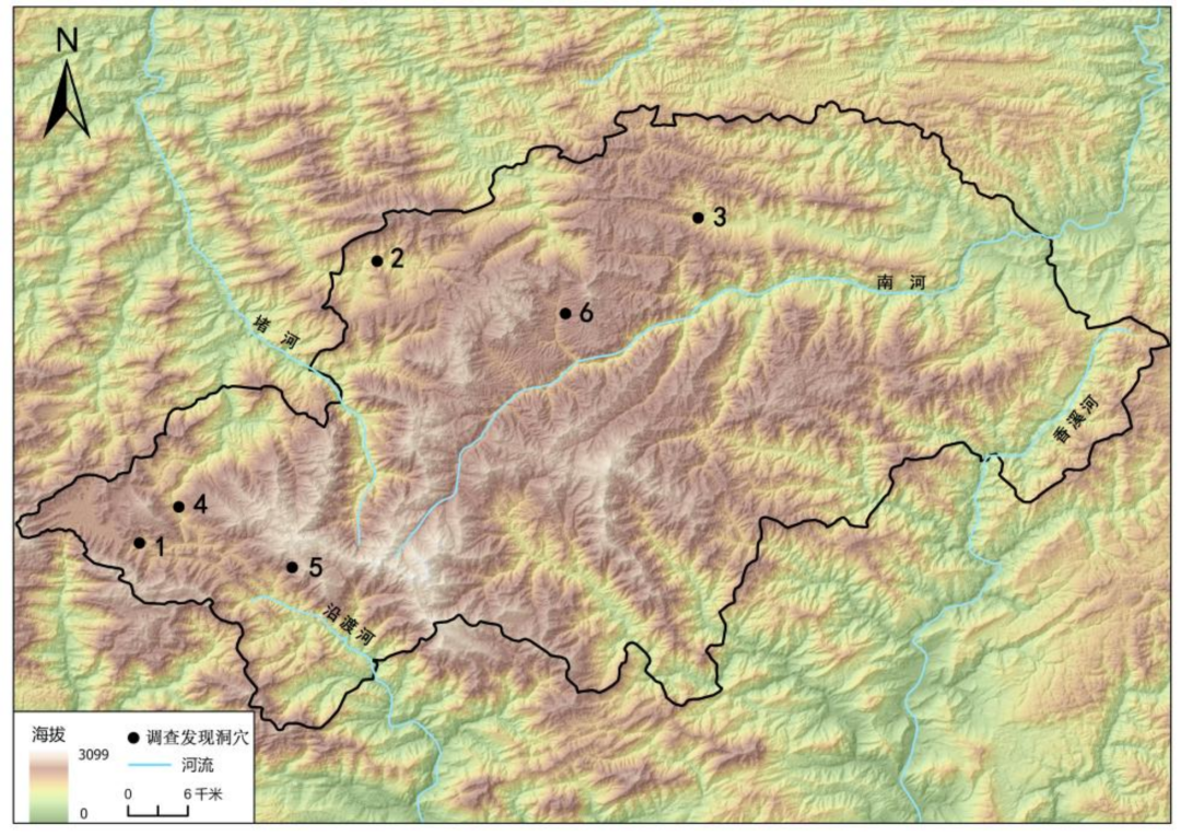 图一 神农架林区发现洞穴位置分布图(1:黄连队洞穴群;2:刘家寨洞穴;3:八封庙村岩洞;4:小九湖洞穴群;5:吊洞湾洞穴;6:犀牛洞遗址)
