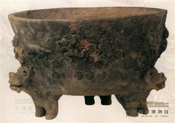 此盆为圆形,青灰地,平口,里面有旋转而成的细擦纹,盆外围涂黑,在光平泥胎上涂细青泥一层,浮砌有龙、猿猴、虎、马、牛、狮等禽兽形象。这些禽兽,有的抱膝箕坐,有的举足高跃,有的漫步缓行,有的振羽欲飞。禽兽的空隙处满布团状物。盆的三足为站立着的三只兽的前部,即三只兽顶着盆。类似的这种兽蹄、鱼蹄足盆,在新疆库车、和阗故址均发现过,一般置于死者头部或足部,每一个死者只有一、两件,似极尊贵者才有。