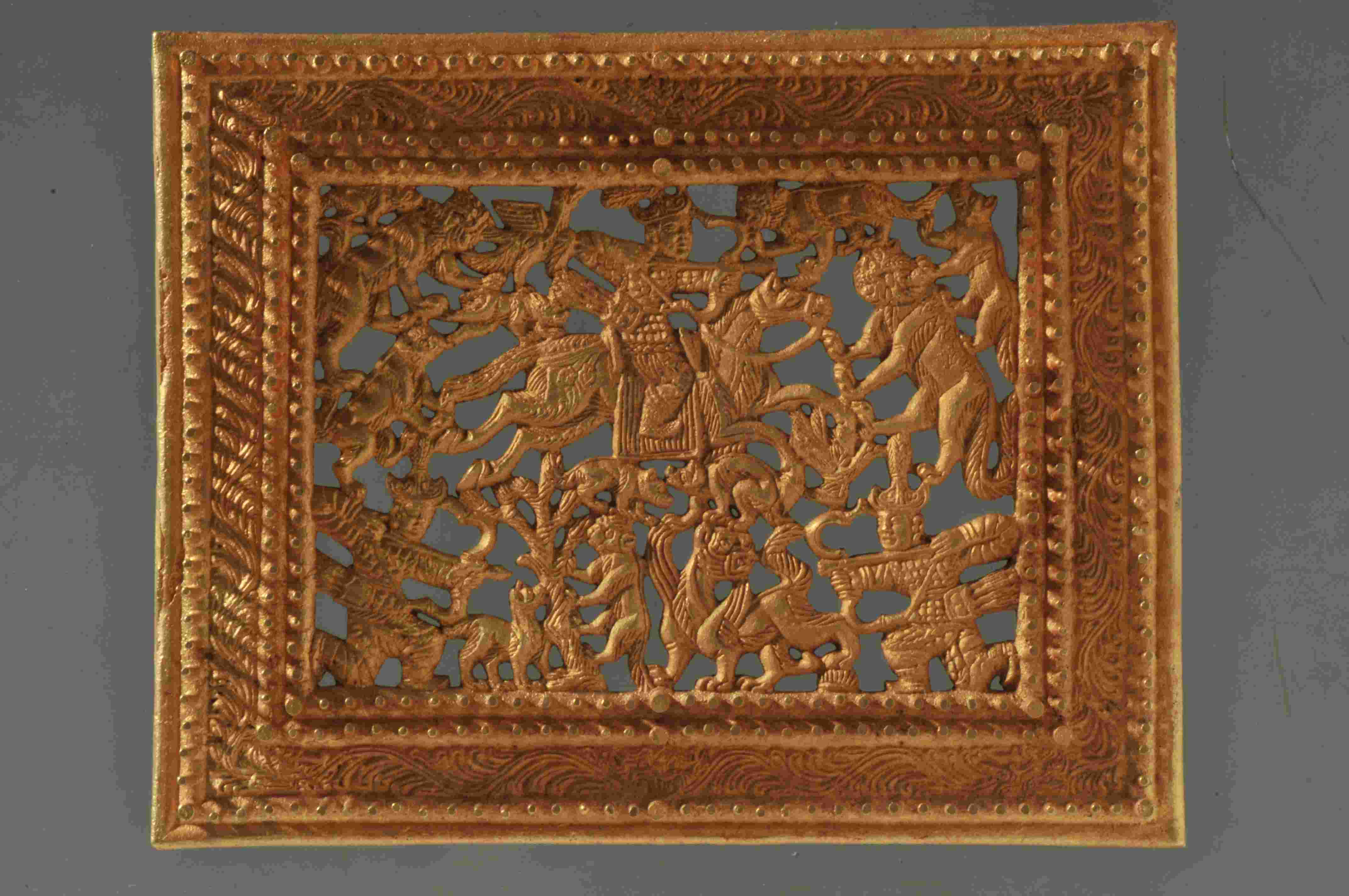 摘要: 金“方奇”这三块器物叫做“金方奇”,均为镂雕法制成泥范,然后以失蜡法浇铸而成。图案清晰,线条流畅,造型精美。三件器物由外而内皆有繁复纹饰,中心纹饰有所不同。其中图案最为丰富的一块金板,正面饰有狩猎图案和连续蔓草纹花边,背面阴刻82字铭文。 铭文铸造在矩形框外之左、下、右三边,为魏碑体隶书,骈体文,正文56字,每四次为一句,落款26字。 ...