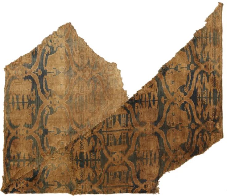 对狮对象牵驼人物纹锦北朝|平纹经锦长39,宽19(单位:厘米)中国丝绸博物馆藏