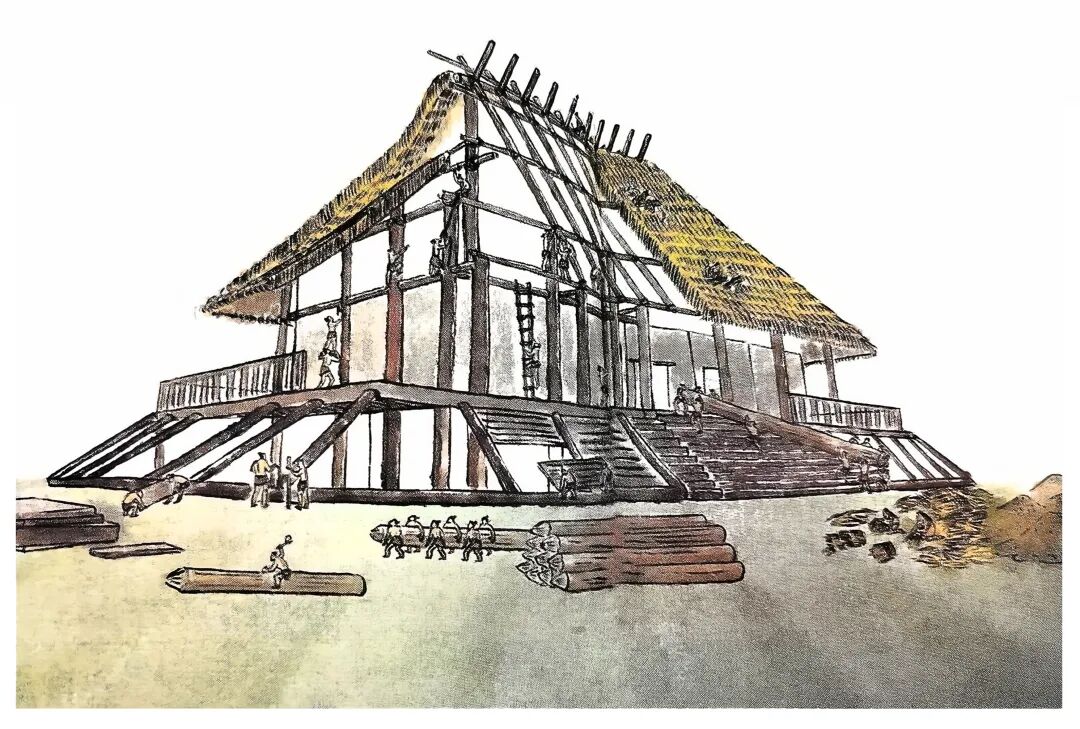 图二 良渚高等级房屋营建图(引自《五千年良渚王国》,曾奇琦绘)