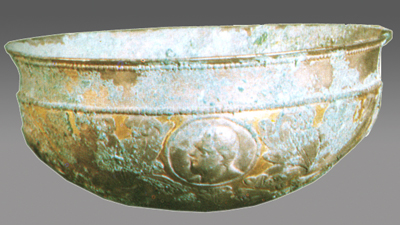 摘要: 鎏金刻花银碗萨珊波斯王朝的文物鎏金刻花银碗是萨珊波斯王朝时期的银质文物,1970年出土于山西大同城南轴承厂北魏窖藏遗址,同批出土的还有鎏金童子葡萄纹高足铜杯、鎏金动物神像纹高足铜杯、八曲银长杯等器物 。该银碗采用锤鍱工艺制作,腹部以忍冬纹分隔四个圆形区域,每个区域内捶雕深目高鼻、长发披肩的男子侧身头像 。银碗口沿及上腹部装饰有小连珠纹 ...