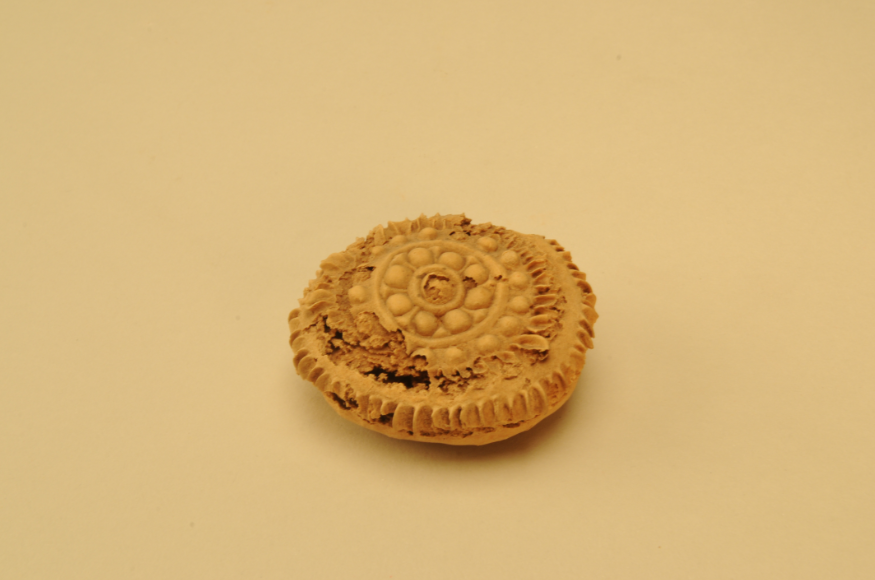 在吐鲁番阿斯塔那墓地出土的各种面食中,宝相花纹月饼无疑是中华饮食文化的典型代表之一。宝相花纹月饼,是1972年吐鲁番阿斯塔那230号墓出土,以小麦粉为原料,模压成型,烘烤制成。呈圆形,土黄色,其上的宝相花纹清晰可见。月饼制作精致,花纹图案搭配得错落有致,造型新颖别致,充分体现了当时人们高超的面点制作技艺。