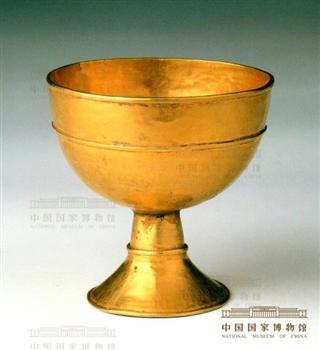 此金杯为大口,口沿外翻,上有凸弦纹一周,系用一圆环焊上。其下为高足,中空,作喇叭状,足柄及底缘亦各有焊上的凸弦纹一周。足柄上端先粘焊一圆片,然后再焊合于杯身。