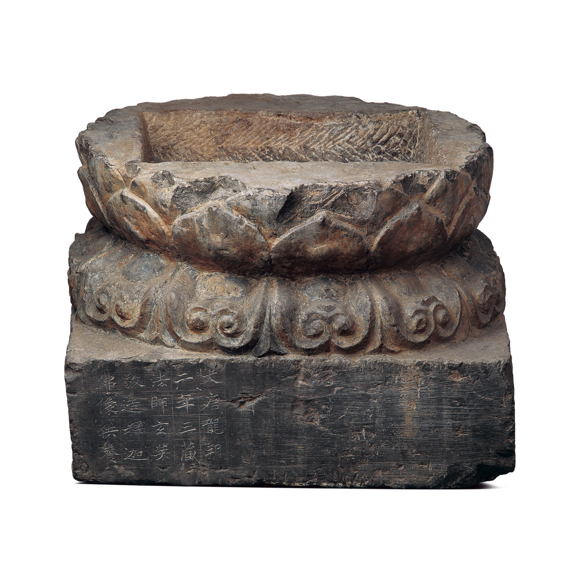 此件由方形底座和莲花座二部分组成。莲花座中间有安置佛像的长方形凹槽,佛像已不存。方形座侧面一边刻有“大唐龙朔二年三藏法师玄奘敬造释迦佛像供养”共20字。