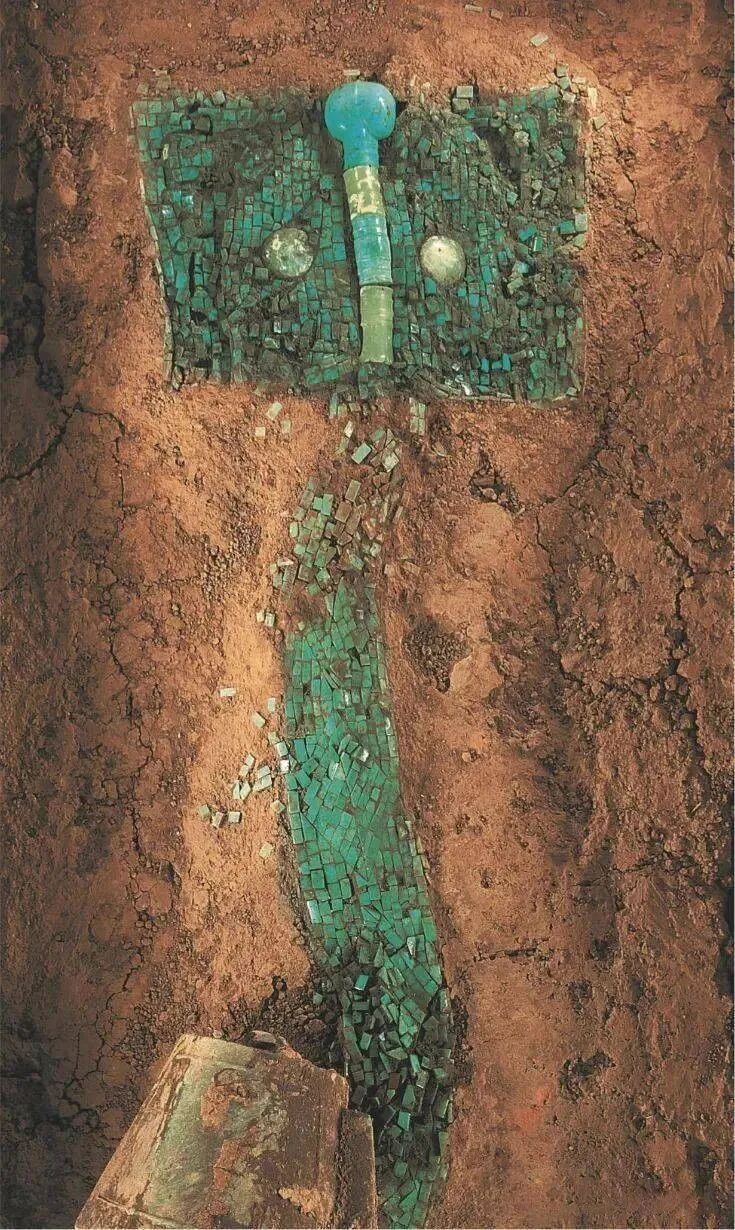 二里头遗址出土的陶器龙形图案分陶塑、雕刻两类。除了陶器上的龙形图案,二里头遗址还发现了许多龙形遗物,尤以镶嵌于漆木器上的绿松石龙形器和镶嵌龙纹铜牌饰最为突出。这些龙形遗物均随葬于大中型墓葬。可推知二里头遗址随葬有龙纹遗物的墓葬规格较高,墓主生前应为较高地位的统治阶层。