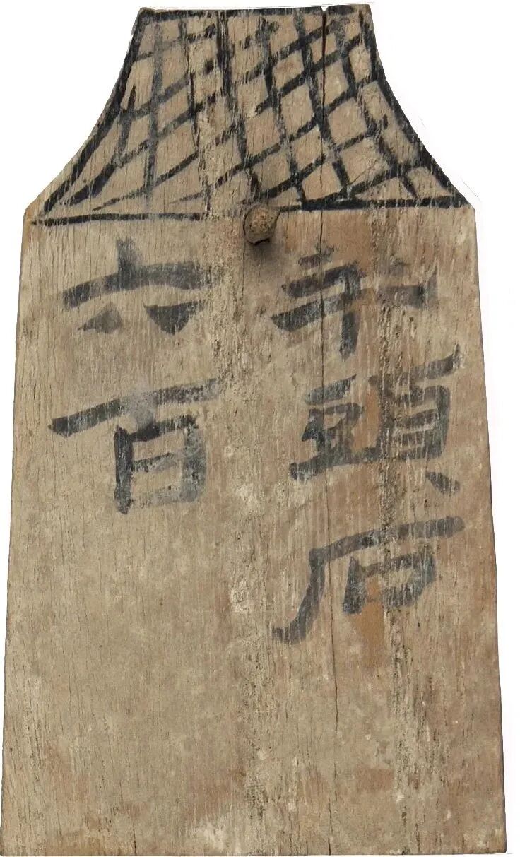 其代表之一《羊头石六百》1986年出土于汉地湾城。原始编号86EDHT:10,木质,长10.1厘米,宽6.6厘米,厚0.5厘米。此简名称为“楬”,用于标记所存放器物的名称、数量、所有者等,推测其使用方式应是悬挂于器物或置架之上。此楬所记“羊头石六百”应属肩水候官所备置的守御器。羊头石,体积如羊头大小,白色石质,置于障坞之上,用于投掷杀敌之用。在 2020年5月18日“国际博物馆日”,甘肃简牍博物馆组织人员去金塔县地湾遗址(肩水候官)考察,整理研究部主任肖从礼就在地上发现了一枚2000年前的羊头石。