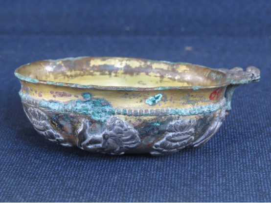 武山博物馆馆藏的唐代鎏金镶银铜碗,为国家三级文物,出土于武山县高楼乡。口径11.2厘米,高⒋2厘米。侈口、束颈、鼓腹、圜底、圈足,口沿外侧向外伸出。呈三角形面,上镶银质高浮雕式卧狮,尾部变宽向下翻卷成一环形柄,通体鎏金,碗内中心及外壁镶有五只卧狮,双眼环睁低首伏于前肢上,鬃毛上卷,后腿半卷曲,尾下垂于后腿底,外壁卧狮间及碗底圈足内镶银质宝相花,外壁颈下饰一圈连珠纹。