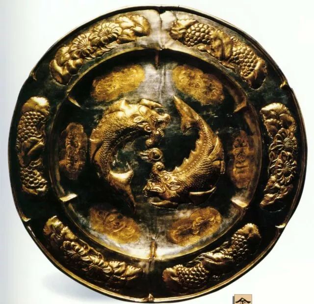 1976年月,在昭乌达盟喀喇泌旗出土了一批唐中期宣州贡器,其中有一件六曲鎏金银盘,此盘高2厘米、直径47.8厘米。圆形,周沿呈六瓣葵形。沿宽7.4厘米,在六只葵瓣上各錾花卉图案一朵,花卉内容有两组,相间排列。盘心凸錾双摩羯图案。双摩羯相向迴泳,鳍尾具备;龙首,双睛圆凸,上唇翘卷,利牙卷舌,面相凶狠,浑身鳞甲整刻细密,刻工精细。在双摩羯之间置一火焰宝珠,珠正位于全盘正中心处。全盘所錾的各组花纹图案上,均鎏金,银地金花,显得格外漂亮。