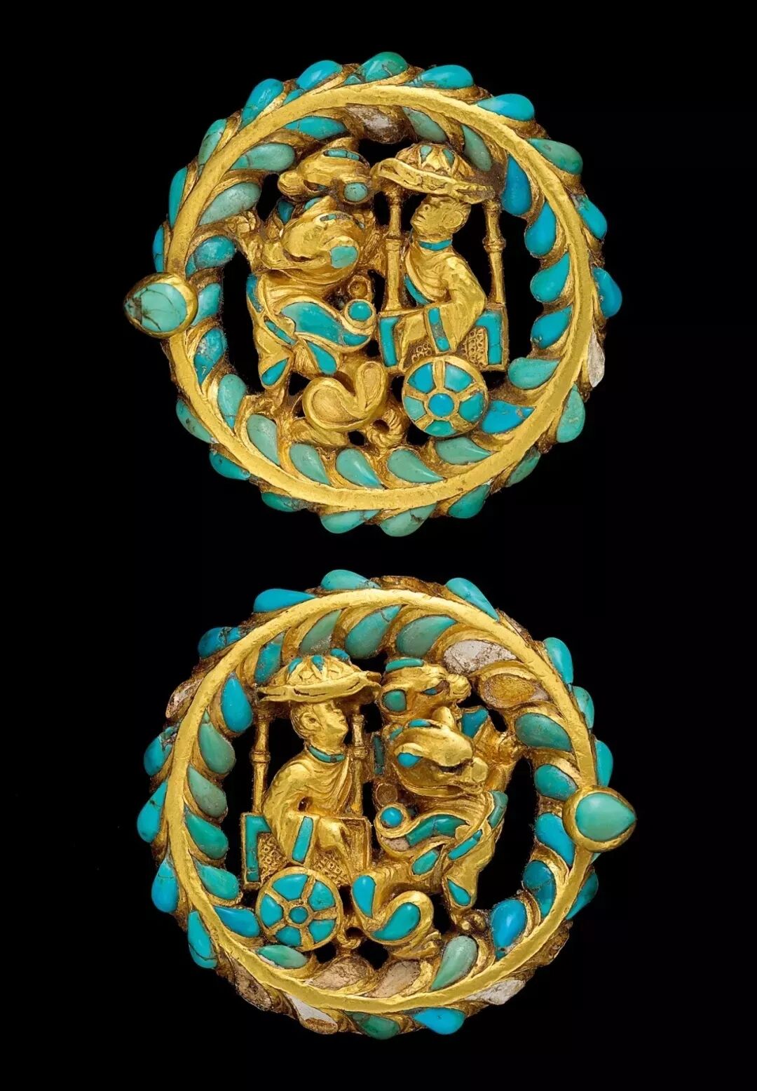 贵霜时代(2—3世纪)金器。1978年11月出土于阿富汗首都喀布尔西北西伯尔罕都城遗址。圆形,其上刻画了一个典型的中国男子形象,身穿汉代服装,坐在一个带靠背的二轮车上,车的形状与汉画像砖上的相似。人头上支着一顶华盖,拉车的是一个像狮子一样的怪兽。西伯尔罕所处的巴克特里亚地区是古代丝绸之路的汇合点,在传递、吸收东西方文化的同时,也以本身的文化影响了邻国。故此为中西文化相互影响、相互融会的珍贵资料。