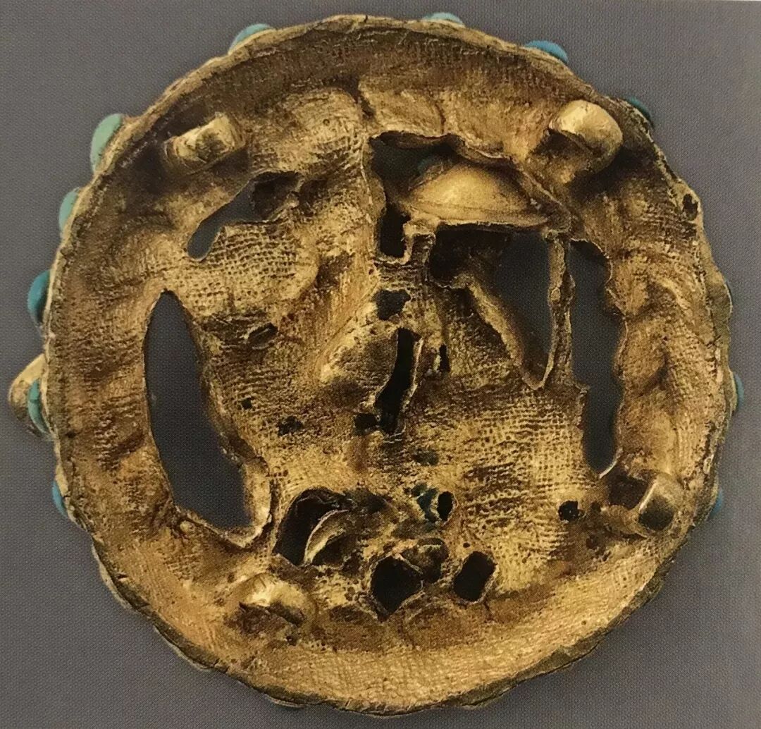 摘要: ▲靴扣 蒂拉丘地4号墓公元25年-50年 金、绿松石、玛瑙 直径5.5cm 高1.1cm