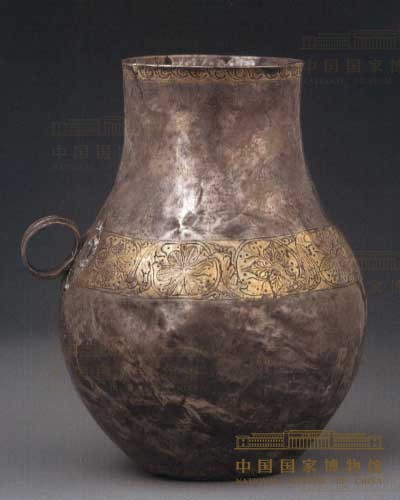 青海上孙家寨晋墓出土。通高15.8,口径7,腹径12,底径5.4厘米。直口,长颈,鼓腹,平底。腹侧置一环形把。口沿、腹部和底边有三组鎏金纹带。口沿勾连纹,腹部纹带由六朵不同形状的花朵组成,底边饰三角纹。其阔叶花纹饰与粟特(今中亚泽拉夫善河流域)银器纹饰相似,纹样中出现的圆点,被认为是粟特银器最具特色的工艺手法。故此银壶当为粟特产品,时代为西晋(265—316),由丝路传入西北。壶现藏中国历史博物馆。