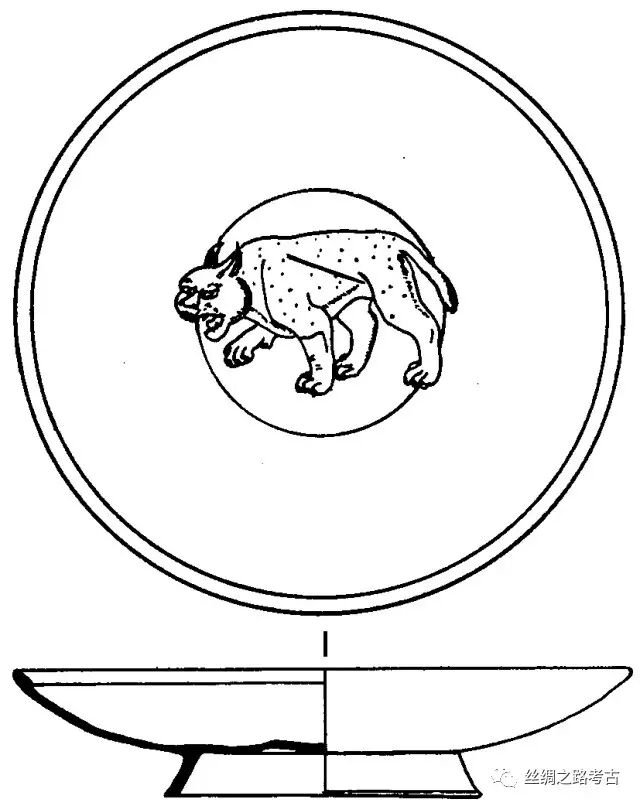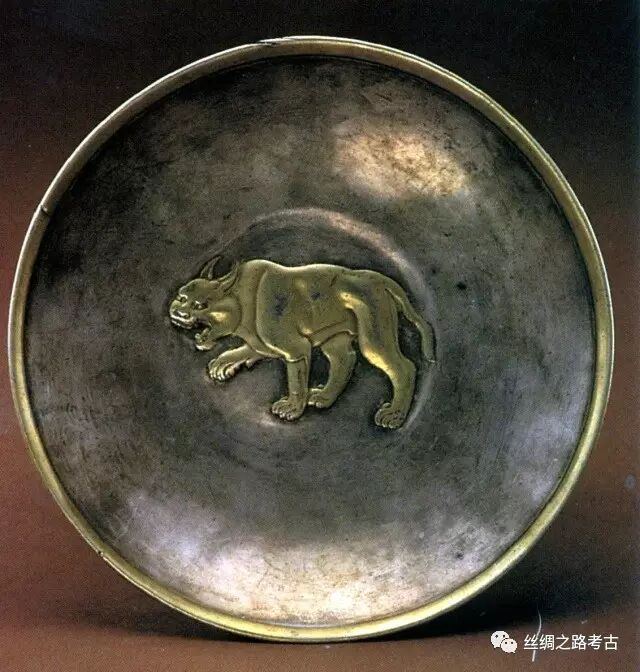 唐代银器。1975年辽宁敖汉旗李家营子出土。高4,口径18厘米。侈口,斜壁,圈足外侈。盘中心有一猞猁或虎状图案。盘心以运动或人物纹装饰,周围空白,是粟特(今中亚泽拉夫善河流域)地区金银器流行式样。此盘应为粟特地区产品,经草原丝路传入今辽宁地区。