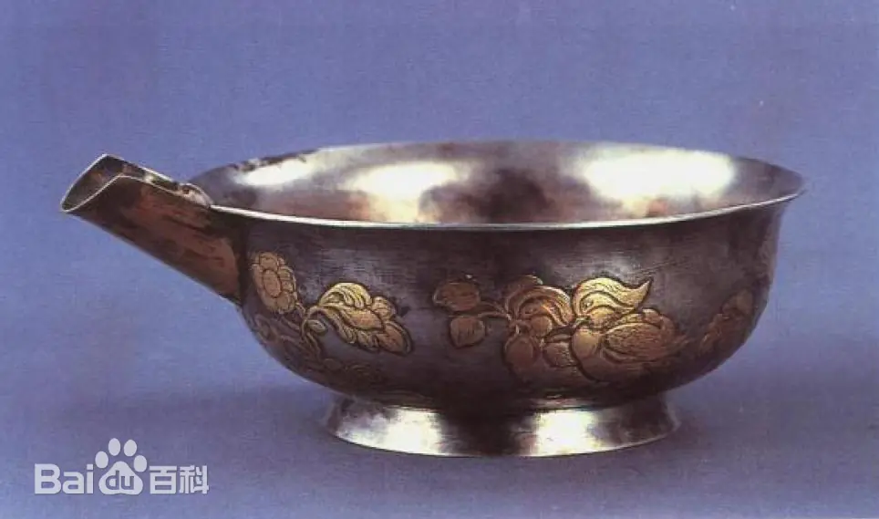 唐代银器。1970年陕西西安南郊何家村出土。盥洗器具。高8~8.4,口径20~22,底径11.9厘米。圆形,敞口,单流,短足。匜外壁饰具有西域风格的宝相花纹图案,余皆素面。现藏陕西历史博物馆。