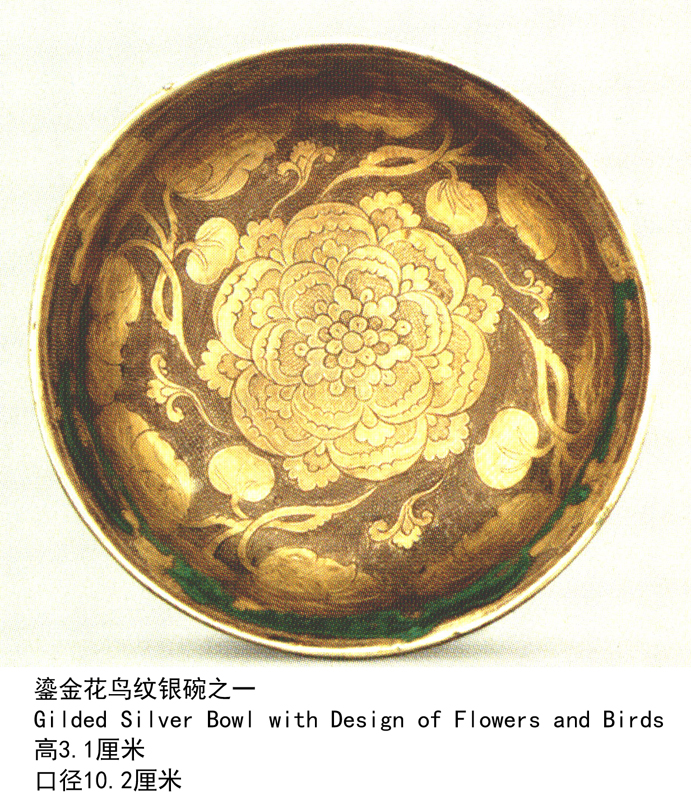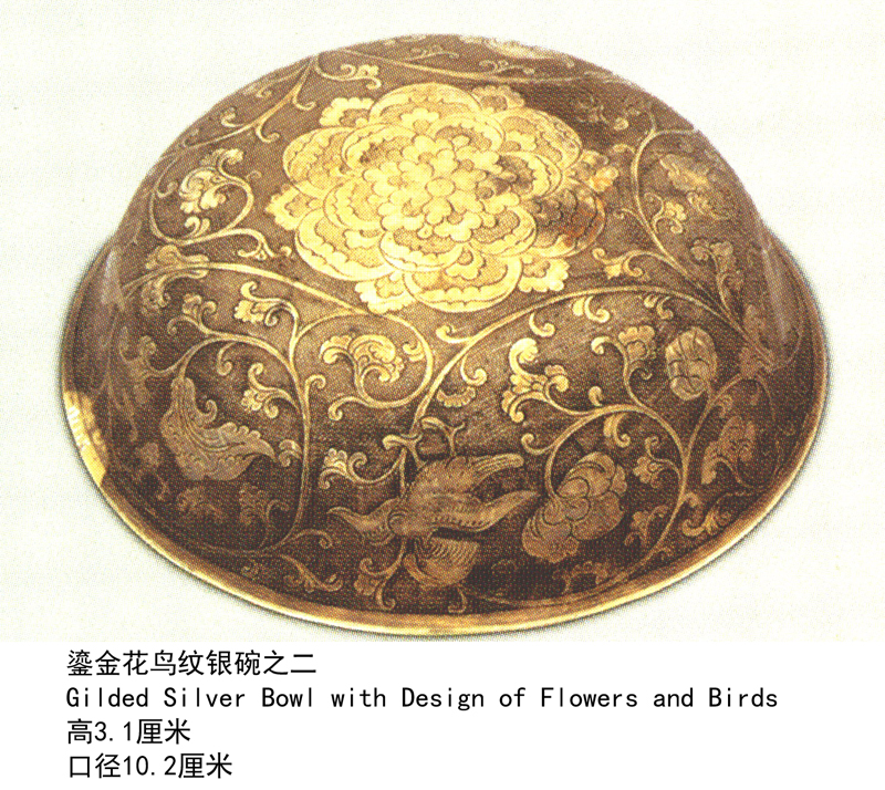 平錾花纹,纹饰鎏金,通体鱼子纹地。碗心及足底各有一朵云勾瓣宝相花;内腹壁饰阔叶折枝大花四株,衬以流云,外腹壁缠枝花草之间刻出二鸳鸯、二鹦鹉。二鹦鹉,其一体形略显魁梧,双耳尖竖,做奔走状;其一身形小巧,振翅飞身,做跳跃状。