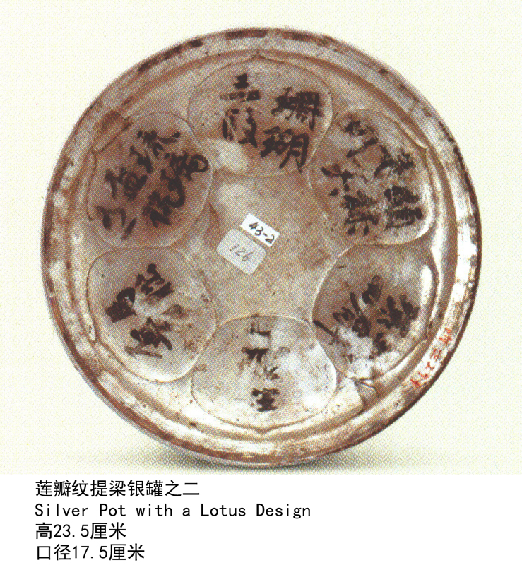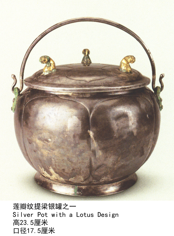 摘要: 莲瓣纹提梁银罐作者:陕西历史博物馆编 Silver Pot with a Lotus Design 在盖内6个莲瓣内有清晰的唐人墨书,记录了当时罐内存放物品的名称与数量。 整个器形锤揲成型。罐身上从罐的颈部到底部錾刻六片莲瓣,这些莲瓣连续展开后环绕器体一周。莲瓣彼此相连突起,增加了立体感,使造型与纹饰浑然一体、大方美观。大唐遗宝 何家村窖藏出土文物展/陕 ...