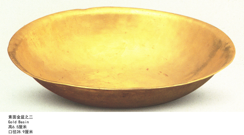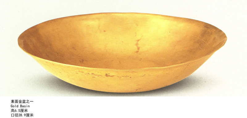 唐代金盆是皇宫内常用的洗漱用具。中国古代金盆,保存至今的很少,从年代上看,以何家村窖藏出土的唐代金盆为最早。该盆虽然通体光素无纹,但厚重大方,透射出高贵、典雅、殷实、富足的气派。