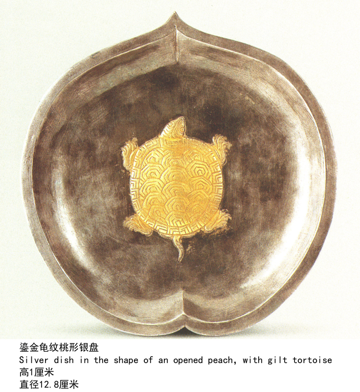 锤揲成型,纹饰鎏金,构图方式上接受了粟特的艺术手法,但在题材的选择上却是中国化的。龟长寿,古人认为它能卜知吉凶,将桃的造型与龟的纹饰巧妙地融为一体,包含着消灾辟邪、长生不老的深刻寓意,是不可多得的唐代艺术品。