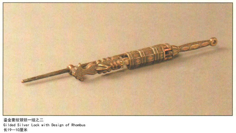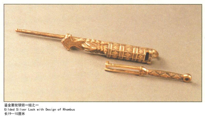摘要: Gilded Silver Lock with Design of Rhombus 银锁是唐代贵族使用的生活用具。分锁体和钥匙两部分,至今尚能使用,开锁自如。制作精美,纹饰考究,该锁采用弹簧结构,靠簧片的张合起到锁闭与开启的作用。 何家村窖藏出土银锁17件,最大的长19厘米,最小的长10厘米,工艺相同,纹饰相近。 大唐遗宝 何家村窖藏出土文物展/陕西历史博物馆编.- ...