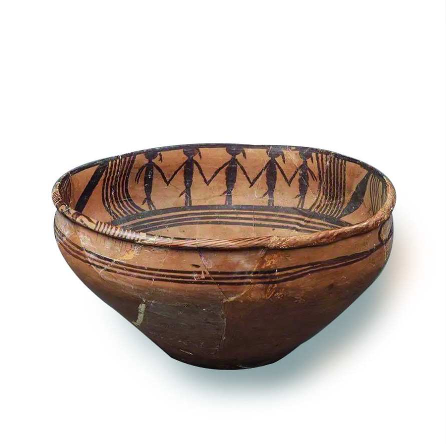 当时,在汉朝墓葬遗址挖掘中,工作人员偶然间从墓室旁边的夯土层中捡到一块带有图纹的陶片,考古人员敏感地发现这不是汉朝的彩陶,而是马家窑时期的物品,就把所有的碎片都拾捡出来,一拼接,发现还有很多缺口,就把这里的沙土用筛子筛了一遍,把石粒、碎片都收集齐全,送往中国社科院考古所修复。于是,一件旷世奇宝再现眼前:这件彩陶盆内壁上有三组图案,每组由五个手拉手的舞者组成,那舞姿惟妙惟肖,盆壁上的先民仿佛要走下来给大家表演一般。据鉴定,这件舞蹈纹彩陶盆是五千年前新石器时期的先民制作的。这是全国发现有舞蹈图纹的文物中距今最为久远的一件。在它出土后,考古工作者、舞蹈艺术研究者、美术研究者的研究文章纷沓而来。