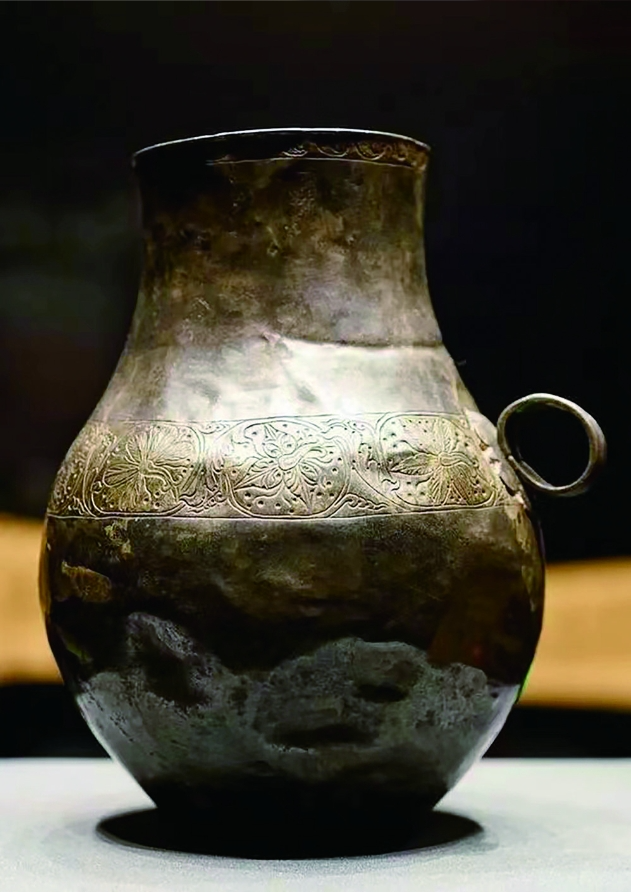 安息国单耳银壶通高15.8厘米,口径7厘米,腹径12厘米,底径5.4厘米。腹侧有一环形把手,口沿、腹部和底边有三组鎏金纹带,口沿勾连纹,腹部纹带由六朵不同形状的花朵组成。整体流溢出巧妙、精美的异域风格。这种风格的银壶在中国境内极少出土,当时考古界对此壶的来源有粟特、希腊、罗马、西亚等不同结论。后经中国考古研究所与德国图宾根大学史前及中世纪考古研究所联合鉴定,认为这是来自安息帝国的艺术品。安息帝国在今天伊朗高原北部,与我国的秦朝和西汉属同一时期,在《史记》《前汉书》《后汉书》多有记载。汉武帝时西域都护班超曾派甘英出使西域,甘英到达最远的国家就是波斯王国前朝的安息国。