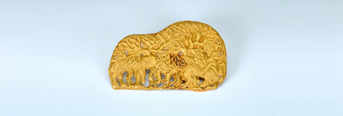 海北州祁连县出土,匈奴文化。纯金制作。器形似起伏的山峦,用浮雕的方法表现出山峦、森林、狼、牛等自然形态,画面中一只狼在森林中正咬噬一头牛的后退,牛作痛苦挣扎状,弱肉强食的自然法则跃然纸上。金牌背部略平展,有两个矩形横扣,应为系挂之用。金牌饰是我国北方草原文化的典型器物,多以动物为题材,是显示身份等级的标志性佩物。该金牌饰件反映了北方匈奴文化进入河湟流域,开始和羌文化交流发展的历史事件。