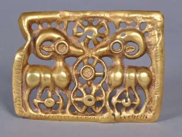 双羊五轮金饰牌是呼和浩特博物院院藏一级文物,出土于1983年,出土地位于呼和浩特市赛罕区太平庄乡添密梁村的一处墓地,考古专家推断墓地年代为北魏时期。饰牌为金质,长方形,边框装饰有阴线纹。金饰牌中的羊纹、车轮等细节,都彰显了不同民族文化融合的印迹。