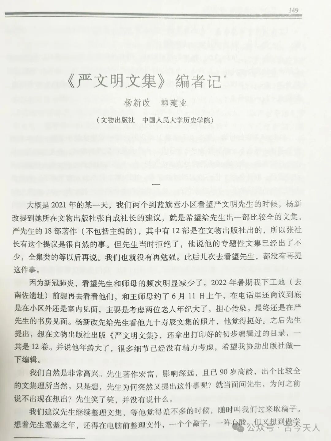 后来又多次向严先生汇报书稿编辑情况,并和严一苹、严松沟通一些细节。比如一苹希望在第九卷《足迹》中加一些家庭照片等。还向赵辉、李水城、张弛老师汇报过编辑文集的事。2024年春节后的2月28日,我去看望先生和师母,和两位老人及一苹再次说起文集事,并代新改说文集年底可以出版(新改因有些感冒没有一起来)。临走时正好郭伟民也来看望严先生和师母,又一起聊了一会儿。谁能想到,这竟然是最后一次和先生面对面聊天了!