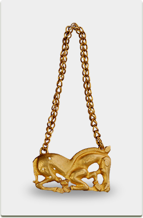 黄金铸造。图案为夸张的马形。作卧马欲起之状。马头甚长,口大张。马耳前竖,马鬃竖起。马身后部有四个铸孔,马尾下垂,较细。马头部与尾部各有一环,环上穿有金链。