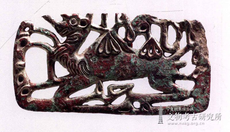 摘要: 单驼透雕铜牌饰发布时间:2018-06-05 09:49:41来源:宁夏博物馆点击:2375 战国~汉代 青铜质 长11.1厘米,宽5.6厘米 1983年宁夏中宁墓地出土 近长方形.虽上边框残断,但主体纹饰保存尚为完整,为透雌双峰单驼图案。骆驼双眼圆睁,两耳直立,嘴唇宽厚,鼻尖前伸翘起,整体取卧姿。前肢后屈,后肢前伸,双峰高耸,四肢跪地,引颈昂首,张口露齿 ...