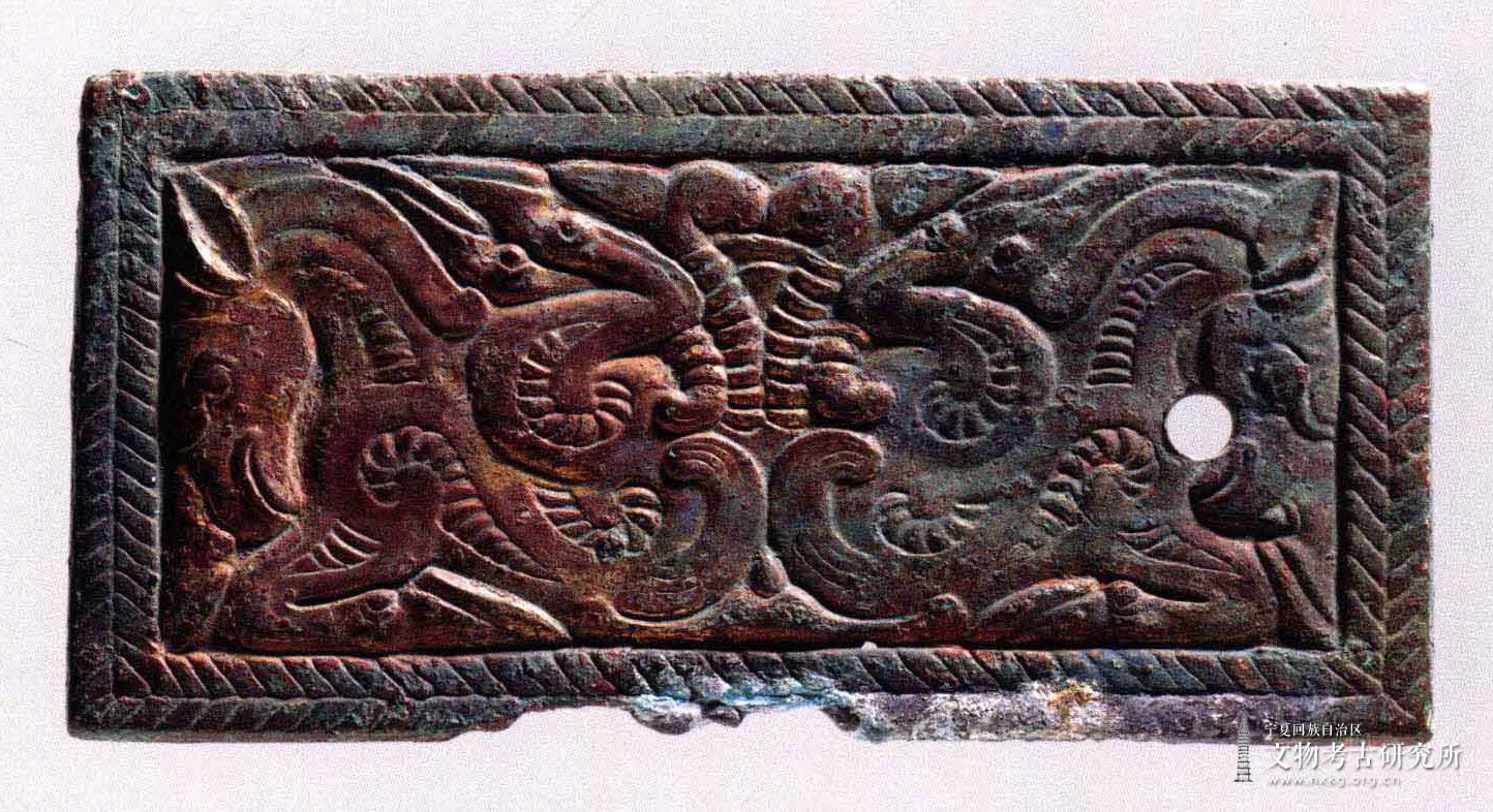 长方形。经初步辨识,正面浮雕有双马图案,左右对称。两只动物各雕一耳,耳如削竹,两眼圆睁,长嘴前伸,前肢屈曲,后肢翻腾至头顶部。两只动物分别在牌饰的两侧,遥相对望,充满嬉闹玩耍之意。整个画面写实、夸张手法并用,刻划细腻。边框装饰的两周浅雕斜线纹饰,扰如一周麦穗纹,更增添了浓郁的生活气息。牌饰左边马首前额处有一圆形镂孔,背面有两个凸起的扣钮。该牌饰虽锈蚀严重,表面鎏金多已脱落。