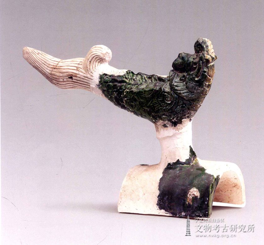 陶胎绿釉。龙首鱼尾,深日凸鼻,翘嘴卷唇,仰首挺胸,颈部一圈鬃毛,全身鱼鳞纹,两侧生有羽翼,背长山形鱼鳍,尾部挺直翘起,分作长短两支,形如腾跃出水。腹部以圆形空心筒柱与脊瓦连为一体,釉色翠绿光亮.造型奇特,形象美观,是西夏庙堂建筑屋顶戗脊上的装饰物。