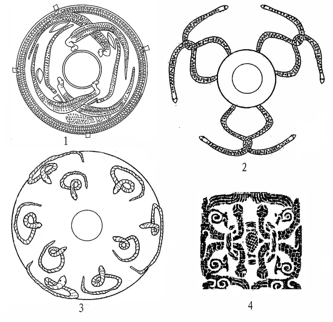 江苏淮阴高庄、镇江王家山、六合程桥等东周墓出土的刻纹铜器中,精美、繁缛的蟠蛇纹、爬行四脚蛇(蜥蜴)纹主题突出,还有青铜盉上的蛇纹提梁、管状环形器上的小蛇装饰等,也都是崇拜蛇祖的正面蛇灵形象。此外,六合程桥墓发现的9件编钟的鼓面和舞面也都装饰类似的蟠螭纹和近似蛇形的螺旋形纹,江西贵溪崖墓的附加堆蛇纹陶坛、福建武夷山闽越王城的蛇纹铜铎等,也属于同类(图三)[13]。