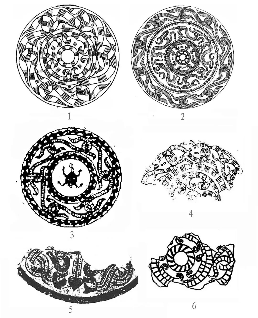 (1. 淮阴高庄 M1:48 铜盘内底外区六蛇蟠绕;2. 淮阴高庄 M1:3 铜盘内底外区十蛇蟠绕;3. 淮阴高庄 M1:0146 铜盘内底六蛇蟠绕;4. 镇江王家山东周铜鉴内底蟠蛇纹;5. 武夷山闽越王城铜铎舞面蛇纹;6. 六合程桥东周刻纹铜内底蟠蛇纹)
